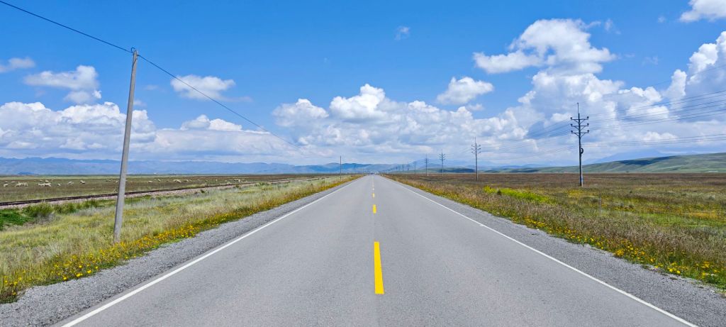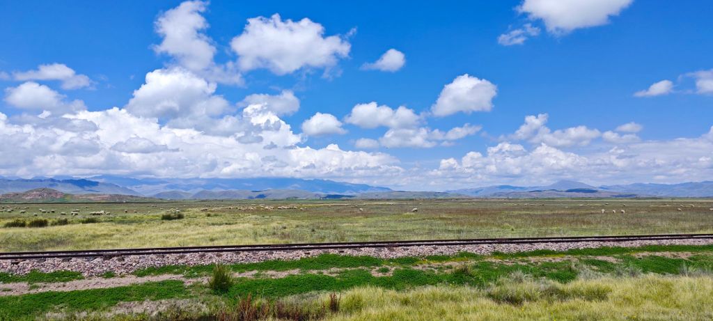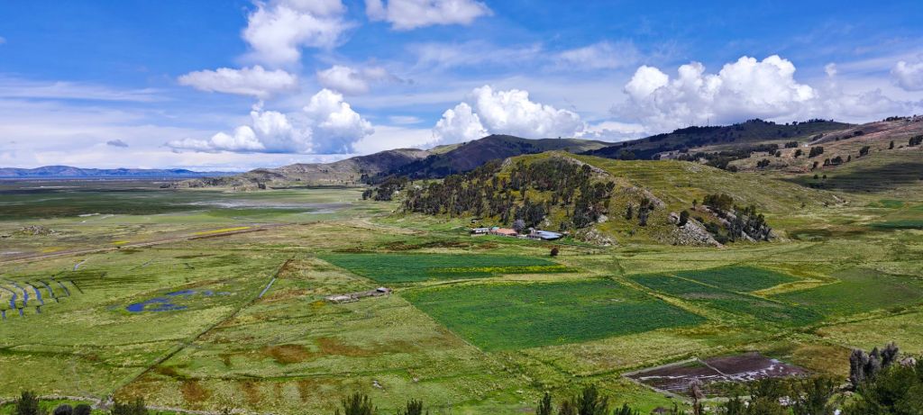 Heute haben wir eine vergleichsweise lange Strecke zurückgelegt, ca. 250 Kilometer. Nach einem kurzen Anstieg auf 4.300 Meter Höhe ging es in einer Hochebene auf etwa 3.900 Meter Höhe fast immer geradeaus. Die Straße war etwas eintönig, es wiederholten sich die weiten, feuchten und grasigen Ebenen, die Schafe, Rinder und Alpacas.