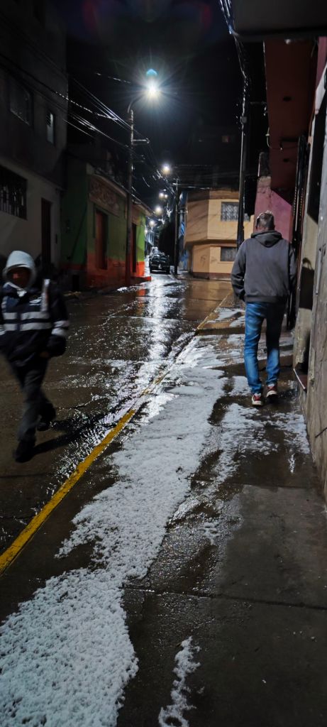Abends Essen in einem Restaurant mit Blick auf die Kathedrale, Alpaca-Fleisch mit Quinoa, bzw. Reis, Pisco Sour zum Nachtisch und ein heftiges Gewitter mit Hagel aussitzen, derweil es im Restaurant von der Decke troff….