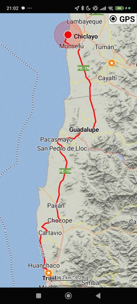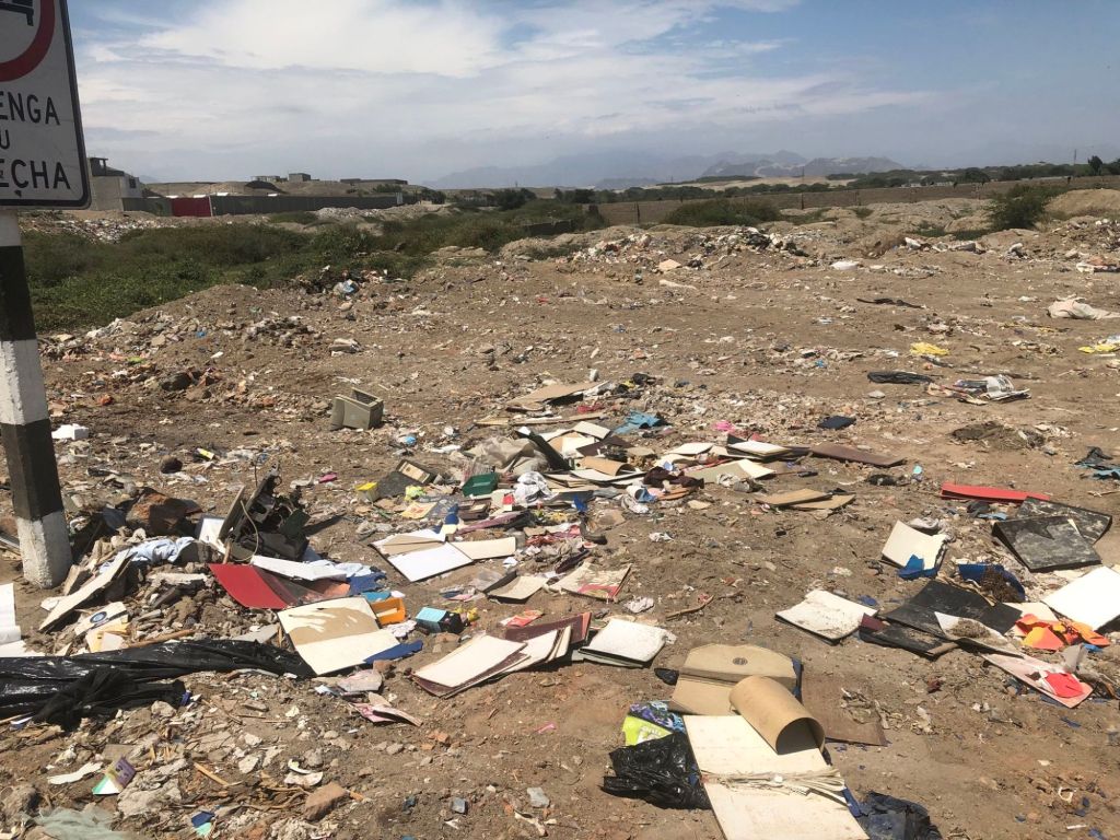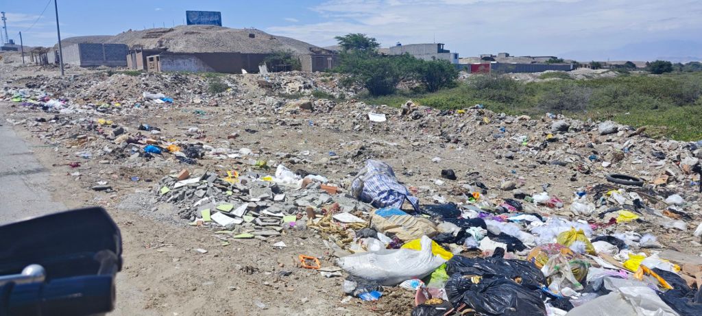 Entlang der Panamericana, in der Wüste vor Chiclayo eine riesige, offene, stinkende, brennende Müllfläche. Da wird wild alles hingekippt…. Und vor allem Plastik, in jeder Form; Plastiktüten, die vom Wind weit übers Land getragen werden – gruselig! An jeder Straße, buchstäblich auf jedem Meter liegt Plastikmüll!!!