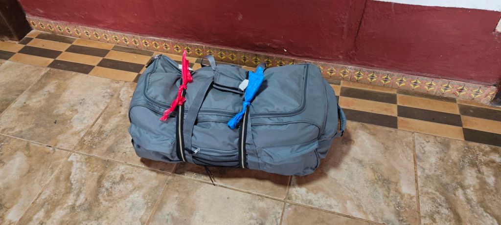 Außerdem soll noch ein zusätzliches Gepäckstück auf den Weg nach Hause gehen. Inhalt: meine Motorradklamotten, die will ich nicht unbedingt weiterhin durch die Gegend schleppen. Die Hundekotbeutelgekennzeichnete Tasche 😁